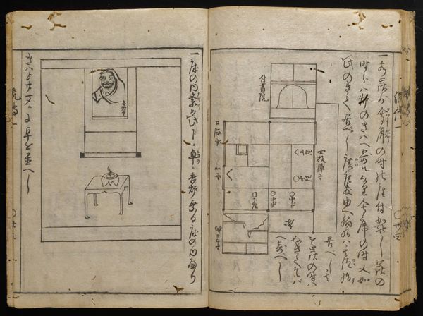 Editor: This is "Promulgation of the Contemporary Tea Ceremony" by Endō Genkan, dating back to 1694. It’s ink and color on paper, part of a book. I find the density of information fascinating, yet intimidating. What's your take on it? Curator: I see a powerful commentary on accessibility and cultural preservation. Here we have what appears to be instructions on tea ceremony, but framed within a socio-political context. Who has access to these traditions? How are they disseminated, and what power dynamics are at play when someone chooses to document or 'promulgate' them? Editor: That’s an angle I hadn’t considered. I was just focusing on the individual diagrams. Curator: Look closer. Is this really just a manual? Or is it a subversive act of democratizing a potentially exclusive practice? What does it mean to put something so refined, perhaps even secretive, into a form reproducible for the masses? Consider who traditionally controlled access to knowledge and ritual during this era in Japan. Editor: So you're saying it could be seen as a challenge to established social hierarchies? Curator: Precisely. How can artistic, social and ritual expressions democratize art and practices for all? It uses a seemingly benign subject—tea—as a vehicle. Can this also reflect larger themes of social progress? Editor: Wow. I initially saw just a quaint instructional guide. Now I see a potentially radical statement about who gets to participate in cultural traditions. Curator: Exactly! Thinking about art as intertwined with these issues helps uncover many fascinating layers!