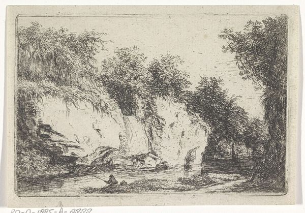 Curator: Alright, let's dive into this intriguing little etching. This is "Ingang van een grot met drie figuren," or "Entrance of a Cave with Three Figures," created sometime between 1798 and 1837 by Ernst Willem Jan Bagelaar. What strikes you first about it? Editor: Honestly, it looks like a portal! A rough-and-tumble escape hatch drawn with furious lines. It's dark, yes, but those figures huddling near the cave mouth seem almost… festive. Curator: "Festive" is an interesting take. The artist was clearly experimenting here, working with rapid pen strokes to suggest texture and depth. The subject, a cave entrance, seems to beckon the viewer inward, yet the shading keeps things ambiguous. Consider how popular Romanticism was during this time. Editor: The kind of Romanticism that romanticized being scared witless? Yes! Because that sketchy opening really feels unsettling—all those jagged strokes. But then, further back, you get this delicately rendered gazebo! Such a strange juxtaposition of terror and leisure. I'm feeling quite conflicted. Curator: Perhaps that's the point. Bagelaar might have been playing with the idea of nature's sublime power against humanity's attempt to tame it. That gazebo symbolizes cultivated space. Think of the political climate of the early 19th century—revolution, social upheaval, but also increasing wealth. Editor: So the drawing becomes this kind of quiet class commentary? The wealthy can play at the edge of chaos because they know they can retreat to their little garden structures. It certainly makes one wonder what Bagelaar was attempting. What the drawing wanted to communicate. It's like an early graphic novel panel where everything happens in a second but is layered with time. Curator: Exactly. A single scene hinting at vast narratives. In this tiny etching, Bagelaar encapsulates grand societal forces at play. Editor: I still think it feels a little like a magical portal waiting to take you… somewhere complicated. Thank you for enriching how I look at the artwork. Curator: And thank you for voicing a first impression to bring our conversation to a rich level of social perspective.