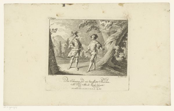 This engraving, titled "Le Scaramouche", presents a lone figure set against a theatrical backdrop. Notice the carefully constructed composition, sharply defined by line work that delineates the character's exaggerated pose and attire. The artist uses hatching and cross-hatching to modulate light and shadow, adding volume and depth to the figure and its surroundings. The figure, Scaramouche, seems to be caught mid-gesture, an embodiment of theatricality itself. The dramatic lean and open palm present a study of constructed identity. What’s fascinating here is the way the print captures the essence of performance. The Scaramouche figure seems to ask us: what are the structural and cultural components that form our understanding of persona? Consider how this engraving, through its calculated form and dramatic gesture, reflects broader inquiries into the nature of representation. It challenges us to question how meaning is constructed.