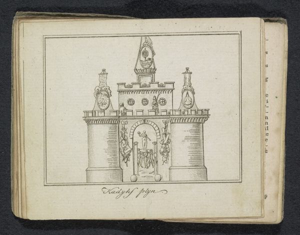 Editor: This is a drawing titled "Decoraties voor het Zeemagazijn en op het Koningsplein, 1795," created in 1795 by an anonymous artist. It’s made with ink, coloured pencil, on paper and is currently held at the Rijksmuseum. The precision of the line work is really striking to me; there's almost an architectural feel. What’s your perspective on how form defines this work? Curator: Indeed. Consider first the balanced asymmetry between the depicted structures: one, an empty archway suggestive of passage; the other, a decorated monument topped with celebratory flags. This duality draws the eye, creating a dynamic tension. The ink rendering, stark yet refined, allows us to focus solely on line and shape. How might you analyze the semiotic relationship between these geometric forms and the narrative suggestion of celebration and civic virtue? Editor: I notice the contrast in shapes, how the rigid square and rectangle of the monument give way to the oval shape surrounding the figures in its center. That breaks the geometry somewhat. Also, it strikes me how the empty arch invites the viewer in, versus the pedestal which seems self-contained. Curator: Precisely. The arch, despite its formal constraint, provides a visual openness, a lack that implies potential. The pedestal, however, contains an inscription. The words, the symmetry, the implied support... How do those formal choices affect your understanding? Do the sharp angles give a more militant impression, do you think, contrasting with the waving flags above? Editor: I hadn’t thought of it like that. It’s almost like a stage for ideas, maybe national pride? Curator: An interesting interpretation. If we understand these decorations purely on a formal level, the meticulous execution reflects order and control while these two decorated structures may also represent spaces for trade and freedom. Both neoclassical themes perhaps? Editor: I guess focusing on structure like this really shows how much you can gather without needing much context. Curator: Indeed. It proves form and intention go hand-in-hand.