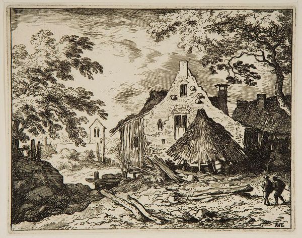 Curator: At the Metropolitan Museum of Art, we're looking at "The Haybarn with Movable Roof," a compelling ink drawing produced sometime between 1621 and 1675 by Allart van Everdingen. Editor: It has such a whimsical, almost Brothers Grimm quality about it. The scratchy textures, that quirky house, everything looks delightfully unsettled! Curator: The piece is an engraving, or possibly a print, reflecting the style we now term as Dutch Golden Age. Think about the historical moment—the rise of mercantile power, the reshaping of landscapes. Editor: You see that so clearly! Me, I am simply taken by how lively and free it feels. He is a landscape painter but what if we imagined that it’s all about home and its secrets? It could be so wonderfully eerie. Curator: The "movable roof" detail on the haybarn isn’t just practical. It’s also Everdingen signaling control over nature—a manipulation. Editor: Ah, a control…or surrender. See how those two figures down near the stream are completely integrated with the mud and muck, like Adam and Eve after a particularly disappointing harvest. Curator: We mustn't over-romanticize rural labor! This era wrestled with complex issues. But yes, even with his skill, his medium keeps its connection to common touch, to the idea of accessibility and distribution. Editor: See! But for me that’s why it still breathes, because, yes, of its cultural importance, but also of the emotional impact and beauty it delivers at first glance. Curator: "The Haybarn" encapsulates key elements in the relationship between man and nature. It invites critical dialogue and the interrogation of traditional views of rural existence, don't you agree? Editor: Definitely! This ink work is much more than lines on the page; it's a meditation, and sometimes a chuckle, about life, isn't it?