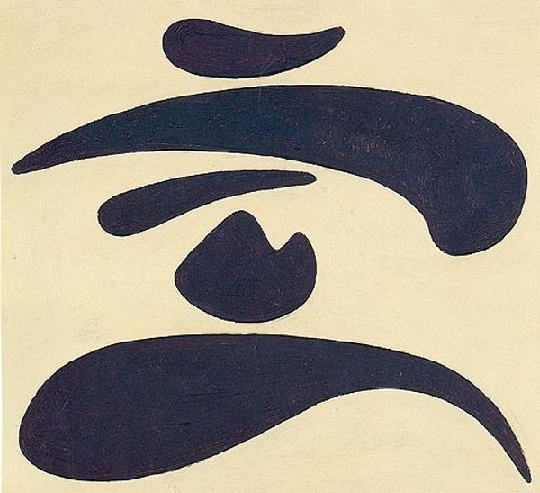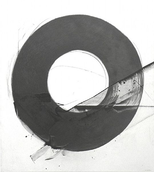 Editor: This striking untitled artwork is by Jiro Yoshihara. It looks like ink and acrylic on either paper or canvas, and features a dominating black circle. I’m struck by its raw simplicity and the way it occupies so much of the space. What do you see in this piece? Curator: The circle, a universal symbol, here pulses with raw energy, doesn’t it? Consider the Ouroboros, the serpent eating its own tail— a potent symbol of cyclicality, of destruction and rebirth, the eternal return. Do you see a similar theme playing out? Editor: I hadn't thought of the Ouroboros, but I can see how the circle embodies a sense of never-endingness. Does the artist's Japanese background influence this imagery? Curator: Absolutely. In Zen Buddhism, the ensō, a hand-drawn circle, represents enlightenment, elegance, and the universe. It’s often open, allowing for movement and development, a visual manifestation of emptiness, or sunyata. Look closely, is the circle complete here? Editor: No, it’s not. There is a distinct break in the form, along with dripping trails of ink. It feels less about perfection and more about...becoming? Curator: Precisely. The imperfection makes it powerfully human. Consider the wabi-sabi aesthetic - beauty in imperfection and impermanence. Yoshihara seems to be capturing a moment of creation, a process of constant change. It's as though the universe itself is taking shape. The circle echoes ancient archetypes and feels charged with symbolic meaning, while it remains decidedly modern and fresh in its abstract simplicity. What’s your feeling about that? Editor: It's fascinating how one simple form can hold so many layers of cultural and personal meaning! I appreciate the connection to both the Zen concept of ensō and the acceptance of imperfection, particularly with those ink drips. Curator: Indeed. It makes one think about the endless potential of a single stroke and how symbols can bridge centuries and cultures.
