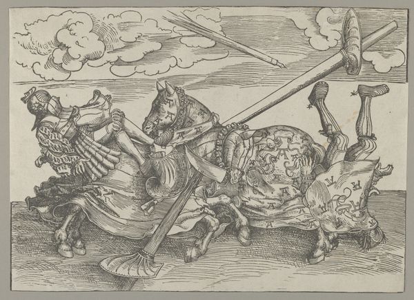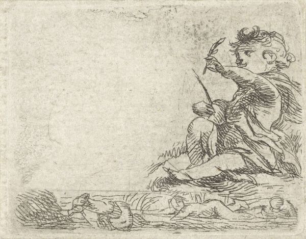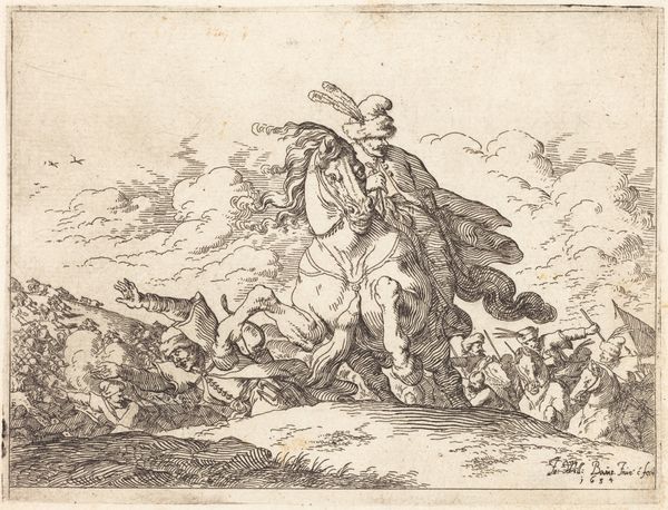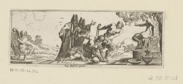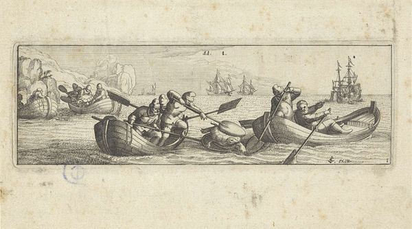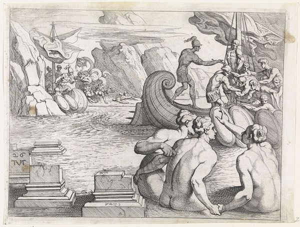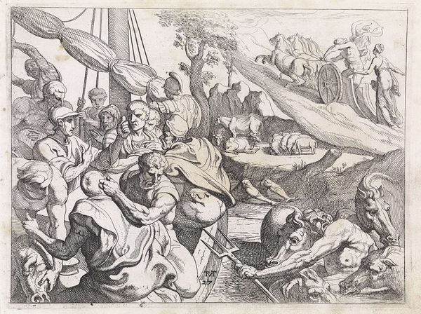 Editor: This is a print, an engraving by Theodoor van Thulden from around 1632, titled "Zephyrus blaast het schip van Odysseus vooruit" or "Zephyrus Blowing Odysseus' Ship Forward." I’m struck by the fantastical, almost dreamlike quality of the scene. What stands out to you in this image? Curator: Immediately, the visual language points us toward classical mythology, but not merely as a decorative element. Look at Zephyrus – not just a gentle breeze, but a muscular figure actively propelling the ship. Notice the symbolic weight; wind, a symbol of fate and divine intervention. How does this resonate with the story of Odysseus, a journey defined by trials and tribulations? Editor: So, Zephyrus isn’t just moving the ship; he's representing something larger about Odysseus's journey? Curator: Precisely! Van Thulden invites us to contemplate the forces – both internal and external – that shape our paths. Consider, too, how the style, reminiscent of Baroque drama, reinforces this sense of momentous occasion. Where do you think viewers might have located themselves within that symbolic language? Editor: Perhaps they saw themselves as voyagers too, subject to forces beyond their control, yet striving towards a destination. The detail is incredible, like those figures aboard the ship... What a lot to unpack! Curator: Yes, and notice how these symbols tie the ancient story to enduring human experiences: resilience, fate, and the continuous striving for home. It’s amazing how the visual memory embedded here still speaks across centuries. Editor: It is fascinating how the artist utilized classical imagery and characters to talk about destiny in a broader, deeply relatable manner.