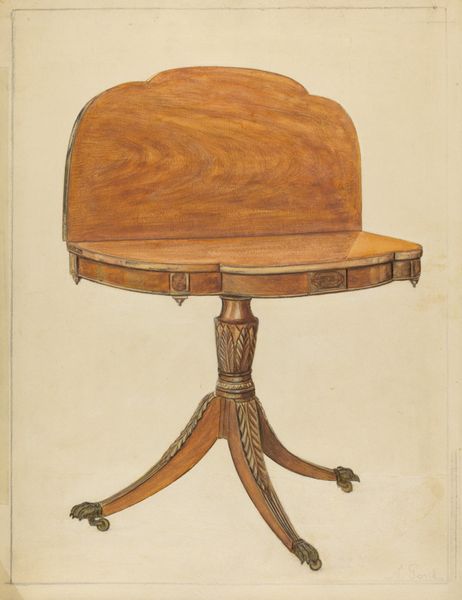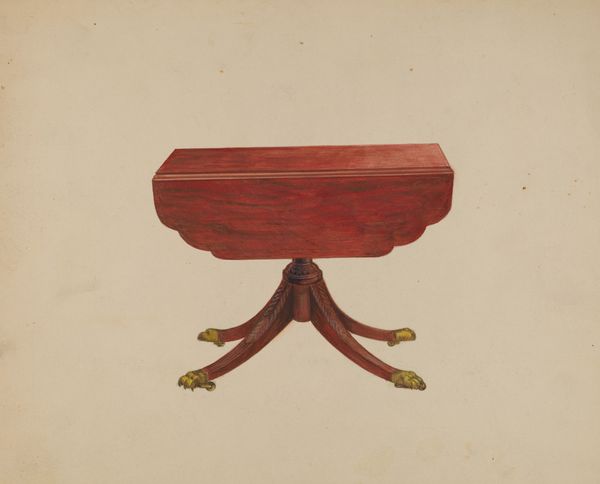 Dorothea Farrington made this drawing of a Drop Leaf Table, likely with watercolor or colored pencil. The color palette is minimal, and the approach to mark making is almost diagrammatic. It reminds me of technical drawings. I find the tabletop particularly interesting. The artist represents the wood grain with delicate, almost topographical lines. These lines follow the curves of the wood, giving it a sense of depth and volume. The legs of the table splay outward, each ending in a claw foot. Farrington's drawing has something in common with the work of contemporary artists like Jennifer Bartlett, who also combines a conceptual approach with a detailed rendering of everyday objects. While Farrington's drawing may seem simple at first glance, it invites us to slow down and appreciate the beauty of functional objects. Art isn't just about grand statements; it's also about the small, quiet moments of observation and appreciation.