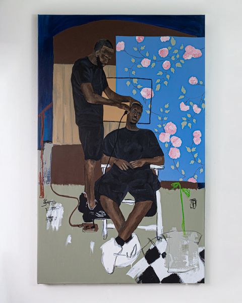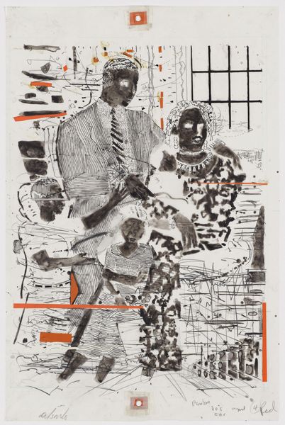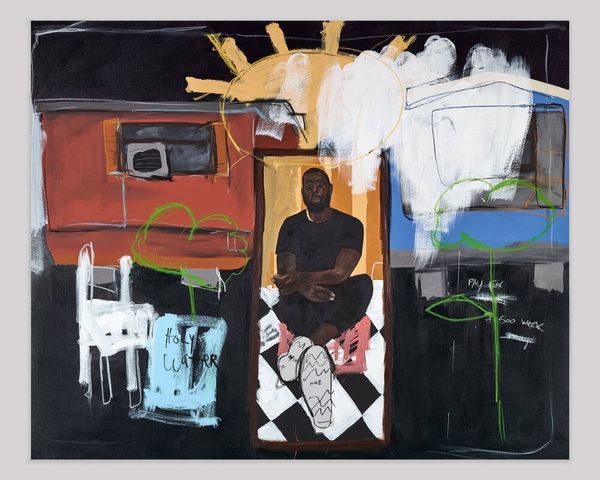 Curator: This is Jammie Holmes’s “School Days” from 2020, created using acrylic paint on canvas. Editor: Right off, I get a poignant feeling, like peering into a half-remembered childhood. It’s sketchy, evocative, raw even. Makes me think about time and memory. Curator: Holmes's style blends a kind of raw figuration with social commentary. The naivety, what some might call it, belies a critical engagement with contemporary culture and a nod toward traditions of history painting. He focuses on figuration, as you can see, foregrounding social settings and narratives, and in this case two figures that are presumably school-aged children. Editor: I love how he uses these very muted tones juxtaposed with such deliberate mark-making. Like, you get this sense of place without it being literal at all. Those dice on the table, though... it's more than just kids playing outside, isn't it? Curator: I agree, I think the use of those materials like acrylic situates his practice firmly within a contemporary moment. I feel that his works often explore social realism, the work depicts subjects relevant to the artist. With the background setting featuring humble housing and foreground action being a game with apparent stakes, Holmes is not afraid to approach charged topics within his immediate surroundings. Editor: The layering creates this sense of history pressing down. It feels like more than one story is trying to escape the canvas. There is something so heavy in his expression while his dice are cast like chance, destiny. Maybe an allusion to the luck these figures will face in life. Curator: That's a really compelling reading. It highlights something about the interplay between individual agency and structural constraints—how these children navigate a system where the odds are often stacked against them. Holmes seems keenly aware of this. Editor: Looking closer, it hits me…the faces. The intensity, those solemn expressions are in stark contrast to the almost child-like way the rest of the scene is depicted. You see a whole lifetime of worries pressing into those little faces. Beautiful and devastating. Curator: Absolutely, and the seemingly nonchalant, off-hand way of rendering things—the fleeting scribbles, erasures, revisions all speak to a deep consideration on how one composes works about these subjects in particular. Editor: This piece feels like a potent mix of nostalgia and unease; Jammie Holmes doesn’t just depict childhood, he dissects it. Curator: Right, the social commentary wrapped in a package of acrylics, the naive forms adding an additional critical lens—that is the genius behind a work such as “School Days.”
