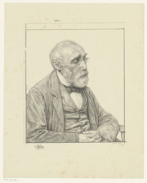Jan Veth rendered this drawing of Jozef Israëls with crayon and pencil. Both men were of Jewish heritage, and key figures in the intellectual and artistic life of the Netherlands at the turn of the century. Israëls, who was in his seventies when this portrait was made, was a celebrated painter of the Hague School, known for his sympathetic depictions of working-class and rural life. Veth, who was several decades younger, was an artist, poet, critic, and socialist intellectual, deeply engaged in the social issues of his time. Here, he captures Israëls in a moment of quiet contemplation, his hands clasped in a gesture that suggests both weariness and reflection. The drawing speaks to the intimate relationship between the two men, and offers us a glimpse into the cultural and intellectual milieu of the Dutch art world. It reminds us that portraiture is not just about capturing a likeness, but about preserving a moment in time, and the complex web of relationships that shape our understanding of ourselves and each other.