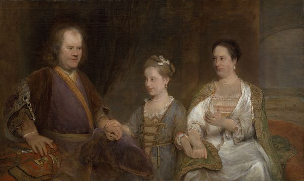 This is Joshua Johnson’s “Family Group," painted during a time of great societal change. Note the formal arrangement of figures, a structured pose suggesting hierarchy and social roles. Johnson’s use of color and composition speaks volumes. The subdued palette contrasts with the bright faces, drawing our eye to the individual portraits within the group. The subjects are set against a dark background. This creates a sense of depth, but also implies an enclosure, as if the family is set apart, defined by internal relationships rather than external context. The painting's structure can be interpreted through the lens of early American social dynamics. The placement of the father, the mother and the children suggests both connection and separation, reflecting societal expectations and familial bonds. The painting invites us to consider how identity and relationships are constructed and represented through formal artistic choices.
