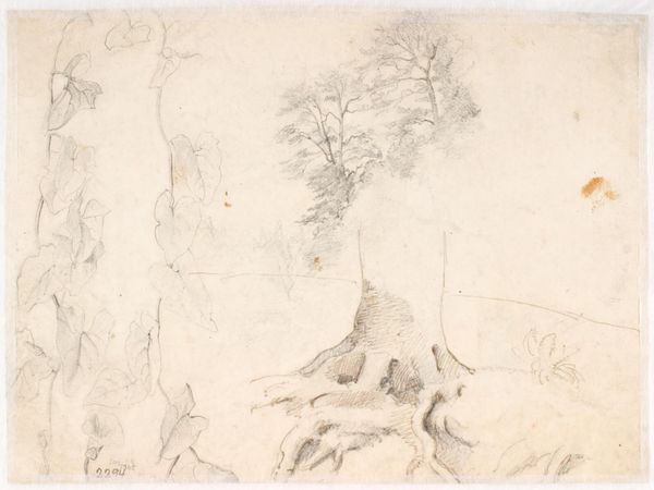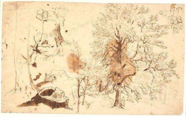 Dankvart Dreyer made this subtle drawing, "Tree Studies" with pen and brown ink, sometime in the first half of the 19th century. The composition divides into two studies of tree trunks, observed in a landscape. The drawing presents a study in structure, the lines creating a complex network that defines the organic forms of the trees. Dreyer plays with positive and negative space, the brown ink delicately contrasting against the white of the paper. Look at how the lines vary in thickness and density, adding depth and texture to the trunks and branches. The drawing's subdued palette focuses our attention on the formal elements: line, shape, and composition. There’s a sense of careful observation, yet also an awareness of the drawing's surface. Dreyer’s “Tree Studies” invites us to consider how a seemingly simple subject can reveal complex formal relationships and convey a rich sense of place.