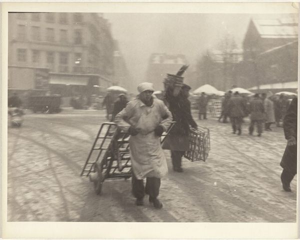 This photograph, *Vendors in Snow, Paris*, was made by Robert Frank sometime in the mid-twentieth century. Look at the way the world condenses to grey scale, to a range of foggy, atmospheric marks that coalesce into an image. For me, it’s the texture that grabs you - the wet ground, the snow falling. There’s this beautiful contrast between the soft, blurred background and the sharp, almost graphic, shapes of the vendors and their carts. The eye is drawn to the dark, repeated forms of the woven baskets, stacked high on the cart, creating a rhythm that cuts through the gloom. It gives the image a strange kind of energy and momentum, and a feeling of the weight being carried by the workers. The picture reminds me of the work of Eugène Atget, who also documented everyday Parisian life. Like Atget, Frank finds beauty in the ordinary, elevating the mundane to something poetic and timeless. Both artists invite us to see the world anew. There’s no easy answer. Just an open ended invitation to see.