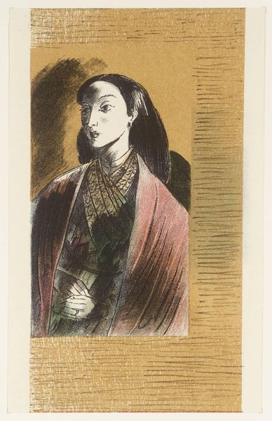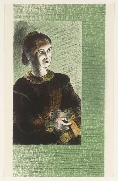 Editor: Here we have an "Untitled" print by Barnett Freedman, currently residing in the Tate Collections. The subject's gaze and gesture give this a dramatic flair. What compositional elements stand out to you? Curator: The layering of textures creates a visually intriguing surface. The textured border and the interior space of the figure compete for dominance. Note how the hatching technique in the figure contrasts with the woven texture around it. What does this contrast achieve? Editor: It makes the figure stand out, but the textured border keeps the eye from leaving the frame. So, it's both a focal point and contained? Curator: Precisely. The artist manipulates the surface, creating a dynamic tension between the figure and its surrounding space. The formal relationships are quite sophisticated. Editor: I never would have picked up on those relationships without your insight. Thanks! Curator: My pleasure. Close looking reveals so much.