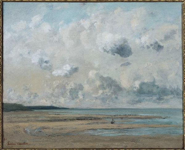 Editor: Here we have Eugène Boudin's "Deauville, marée basse," painted between 1860 and 1865. The scene is quite moody with its heavy clouds. How do you interpret the visual elements, specifically how the composition conveys that atmosphere? Curator: Indeed. Notice how Boudin juxtaposes the weighty, tenebrous sky with the flat, broad expanse of the beach. The dynamism of the clouds is amplified by the stillness of the water, creating a dialogue between transient atmospheric conditions and the enduring quality of the shoreline. Observe the materiality of the paint; the thick impasto in the sky contrasts with the thinner application on the beach, reinforcing this visual dichotomy. What do you observe about the placement of the figures within this structure? Editor: Well, the figures seem quite small and almost insignificant compared to the immensity of the sky, adding to that sense of overwhelming atmosphere, and maybe loneliness? Curator: Precisely. The artist positions the figures low on the horizon line and scatters them across the beach, further emphasizing their vulnerability in the face of nature’s grandeur. This strategic arrangement amplifies the pictorial tension between humanity and the elements. It’s interesting how such visual elements build towards an emotive quality, independent of any narrative. Do you agree? Editor: Absolutely, it really highlights how formal elements create the painting's impact. I never looked at it this way! Curator: These paintings can be rewarding through close observation and structural assessment.