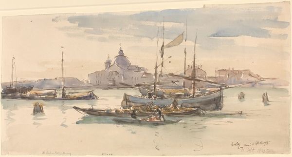 Editor: James McBey's watercolor, "Redentore," created in 1924, captures a harbor scene. It feels almost dreamlike with its muted tones, but the texture seems carefully considered. What do you see in terms of composition and form? Curator: Notice first the careful arrangement of lines: the masts reaching upwards are almost calligraphic, aren't they? They establish a rhythmic visual scaffolding against the more muted horizontality of the water and shoreline. And how do you interpret the washes of colour? Editor: They seem to dissolve the forms, especially in the background, creating depth. But the contrast between the detailed boats in the foreground and the almost ethereal buildings behind is interesting. Curator: Precisely. Consider the spatial organization here. McBey uses aerial perspective, of course – colours desaturating into the distance, creating recession. But look closer. Do you think it helps create an unsettling, slightly flattened picture plane overall? It almost denies a true sense of depth. Editor: I see what you mean! Despite the receding detail, the colour palette maintains a consistent tonality which in a way flattens the picture. Why do you think McBey chose to depict the scene this way? Curator: He perhaps wanted to emphasize the abstract qualities of light and atmosphere, overriding a purely representational goal. The interplay between form and formlessness becomes key here, doesn't it? The materiality is deliberately drawing our attention, because even the city in the distance is reduced to almost nothing, nearly becoming like a mirage or idea. Editor: It does! Thank you for pointing out how the details and aerial perspective both work to add a kind of formal tension! Curator: Indeed. I noticed new layers of form in what I first considered was solely landscape; every conversation helps highlight a new level of abstraction in it.