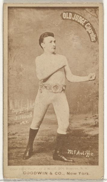 Curator: This image of Tommy Warren, a baseball player or perhaps a boxer, comes from a series of collectible cards issued between 1887 and 1888 by Goodwin & Company for their Old Judge Cigarettes. It’s currently held at the Metropolitan Museum of Art. Editor: My first thought is how much it resembles a vintage photograph, sepia-toned and a little grainy, despite ostensibly being a print. There's an interesting blend of formality and grit. Curator: Precisely! The sepia tone is suggestive of early photographic processes, yes, but the key here is understanding its function as a trade card, mass-produced to be included with tobacco products. This collapses traditional artistic hierarchies; it's both a portrait of a celebrity athlete and advertising material. Editor: I'm curious about the implications of a cigarette company using athletes to promote their brand. It feels so contradictory given modern health consciousness, but also speaks to a particular historical moment when physical prowess and mass-produced goods became intertwined in the public imagination. Curator: Absolutely. The cigarette cards functioned as a means of popularizing figures like Tommy Warren. The consumption habits, specifically tobacco use, played a role in elevating athletes to celebrity status, which were distributed widely and became a tool for marketing and branding. This connection, made so visibly here, shows how sport became embedded in a wider culture of consumerism. Editor: And there's also the materiality of it—it's on paper, likely thin and easily damaged. It was meant to be handled, traded, and potentially discarded, which adds a layer of ephemerality to the image. It shows an intentional blurring of lines between art, consumerism, and celebrity, intended for widespread circulation and consumption. Curator: Indeed. Considering this, the photograph suggests a deeper commentary on how our values, like athleticism, have become products within broader economies. It asks who produces the image, how it's distributed, and what message is encoded in that production process. Editor: So, instead of just viewing it as a vintage image, we should think about its active role in shaping the culture of that era. Curator: Precisely, thinking of it in its historical and commercial context deepens our understanding, allowing us to think of how the portrait participates in the networks of fame and manufacturing of social identity, making us more attentive to our contemporary moment.