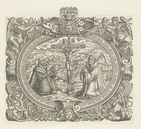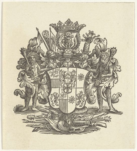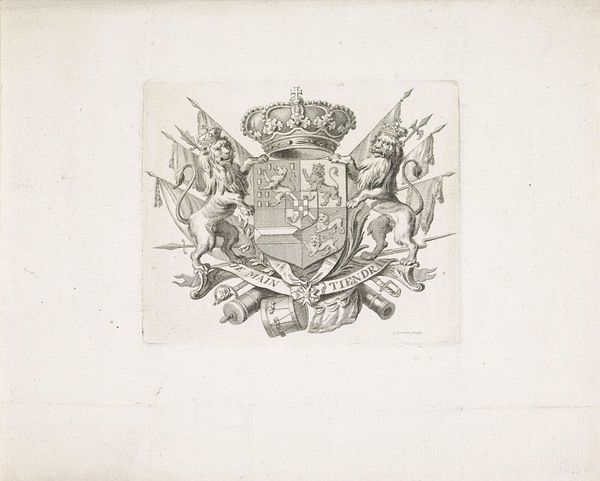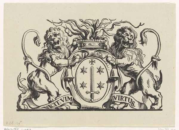 Editor: This is "Vignet met het wapen van de stad Haarlem," a pen and ink drawing from around 1681 to 1740, by Isaac Vincentsz. van der Vinne. It feels quite formal and symbolic. What do you make of this city's emblem? Curator: Well, at first glance, it appears to be a fairly standard heraldic design. Two lions flanking a shield – familiar imagery, isn’t it? But look closer. The lions, symbols of courage and strength, support the shield, of course, but what objects are *on* that shield? What do bells represent to you? Editor: The bells are unexpected. I’m not sure, warning or... celebration? Maybe the sword signifies justice or authority? Curator: Perhaps, but let's also think about it from a cultural memory standpoint. Bells have often been associated with civic life, announcements, and even warnings of danger. What about the stars, what celestial associations could those draw in the viewer’s eye, pulling our thoughts heavenward? Editor: So, it's not just a static image; it's actively trying to communicate specific values and perhaps even prompt certain feelings about Haarlem. What of the branches between the lions? Curator: Ah, those could easily symbolize growth and prosperity. All these pieces combine to form an allegory of the city. The heraldic design invokes an ideal – the collective identity. Does knowing some of these hidden meanings give you a different perspective? Editor: Definitely! I appreciate seeing the historical, almost psychological layering of meaning, connecting symbols to feelings of pride and collective identity. Curator: Precisely. Heraldry is about memory. Remembering values is the essence of such depictions and in this instance gives shape to the ongoing cultural identity of Haarlem.