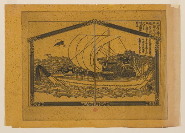 Félix Hilaire Buhot created this monochromatic etching, "Boot van Dai-ko-ku," now housed in the Rijksmuseum. The composition is immediately striking for its density of detail, with a multitude of fine lines creating textures that ripple across the waves and define the form of the boat. The boat is enclosed with a graphic frame creating a scene within a scene. Buhot's strategic use of line directs our gaze across the boat with its mythological creatures and billowing sails. The etching's structure encourages a semiotic reading; the vessel, laden with mythical figures, may symbolize the transport of cultural ideas, challenging the idea of fixed or singular meanings. The composition draws us in, inviting contemplation on themes of cultural exchange and the fluid boundaries of interpretation. Note how Buhot uses line not just to depict but to suggest movement and transformation, underscoring that art is a dynamic and constantly evolving field of enquiry.