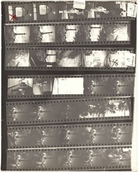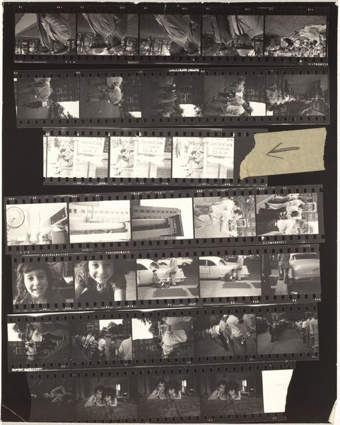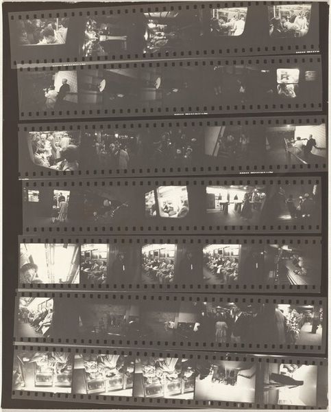 Editor: So, this is Robert Frank's "Pablo and Andrea--New York City AI," a contact sheet of gelatin silver prints from around 1957 or 1958. It's striking how immediate and intimate it feels, almost like a visual diary. What stories do you see within these frames? Curator: This contact sheet is more than just a record; it's a window into Frank's process and the social landscape of the time. His work is deeply intertwined with a critical look at American society, challenging the post-war idealized images. How do you think the format itself—the grid of images, the visible film edges—contributes to this narrative? Editor: I hadn't considered that! I guess the rawness makes it feel more like a collection of fragments, like snapshots of real, imperfect moments. It feels more authentic and vulnerable. Curator: Precisely. And think about the subjects he chooses. Frank often focused on marginalized communities, questioning power structures and highlighting the experiences of those often overlooked. Does seeing the variety of shots on the contact sheet – some of what seems like wealthy diners and other shots that are hard to parse – lead you to a greater awareness of those issues? Editor: I suppose I’m seeing a stark contrast between the wealth of some scenes and a more gritty reality elsewhere, but the exact narratives remain elusive because of the AI processing blurring out many of the details.. It pushes me to think about what Frank was trying to say about America through these diverse subjects. I’m fascinated by this contrast, almost like a critique. Thank you, that was insightful! Curator: It's in this friction, between what is presented and what is revealed, that the real power of Frank's work lies. Art challenges us to question everything we think we know.