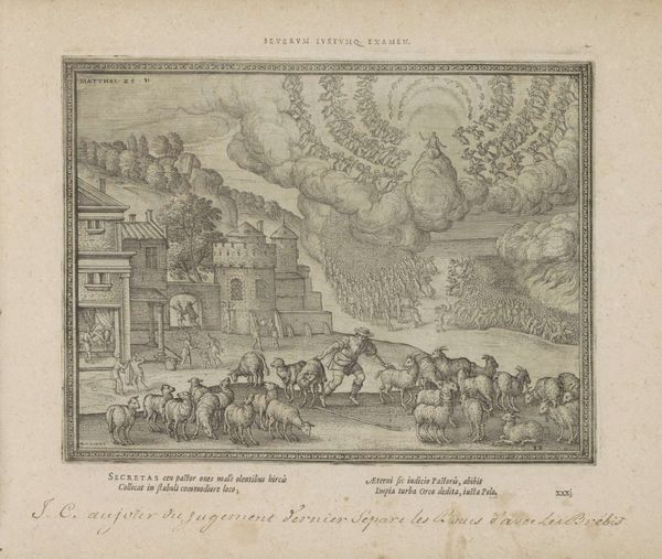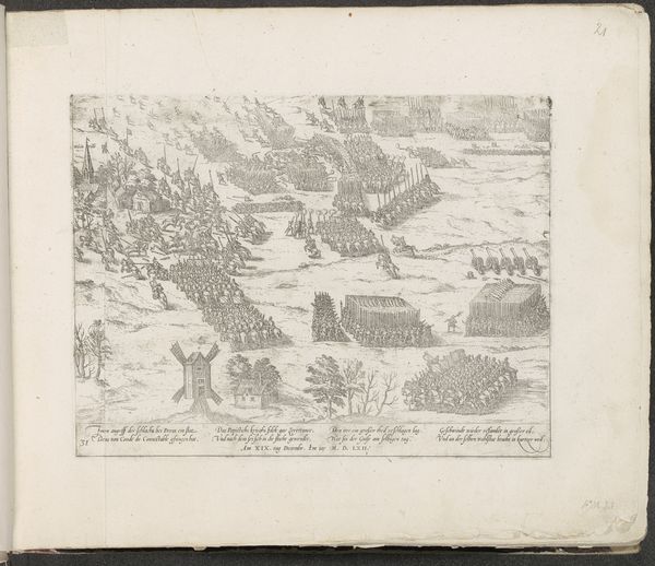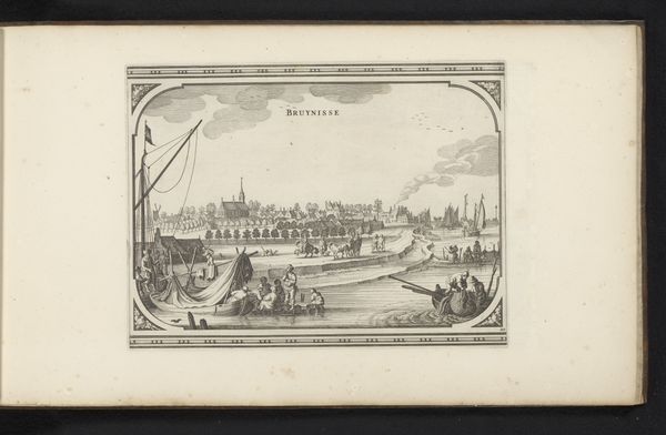 Editor: This engraving, "Brand in Paramaribo, 1821," is attributed to Pieter van der Meulen. It depicts a fire engulfing a cityscape. I find the contrast between the detailed ships in the foreground and the chaotic blaze in the background quite striking. How would you interpret the composition of this print? Curator: The spatial arrangement immediately draws attention. The fire dominates the upper portion of the image, its thick, billowing smoke contrasting sharply with the relative calm of the ships below. What effect do you think this dichotomy has on the overall reading of the work? Consider the perspective, how it flattens the city yet foregrounds the ships. Editor: It almost feels like the ships are observers, separate from the disaster unfolding onshore. The artist is contrasting their stillness with the violent burning happening on the coast. Curator: Precisely. Note the technique: tight, controlled lines to delineate the ships and the subtle gradations used to depict smoke and fire. These formal choices contribute to a visual tension, don't you think? Does the tight rendering change our perception compared to a more expressionistic fire? Editor: Absolutely. The meticulous details give it a sense of documentary, almost like a news report. Something less tangible perhaps than pure visual analysis is how that sense of detachment creates tension. I hadn’t considered how closely the artist's line-work shaped my impression of what this print is trying to express. Curator: Indeed, formal choices always mediate our understanding. By focusing on those choices, we reveal what cultural documents these artistic renderings ultimately are.