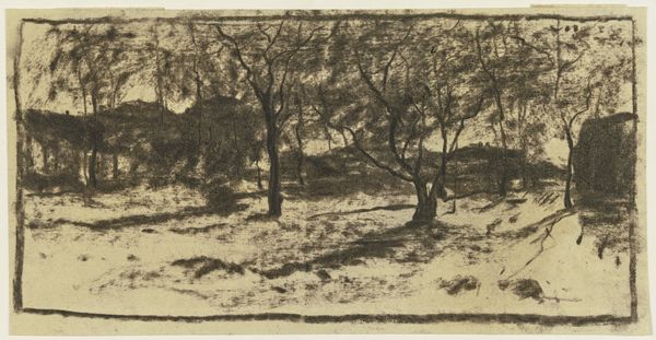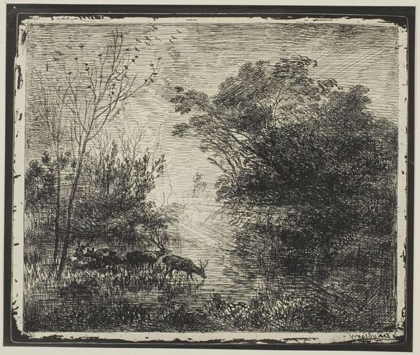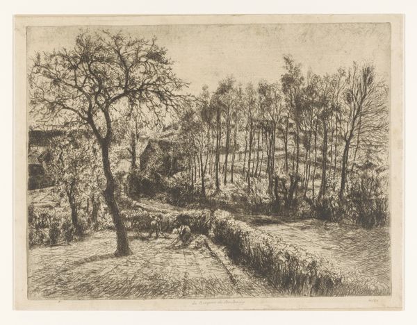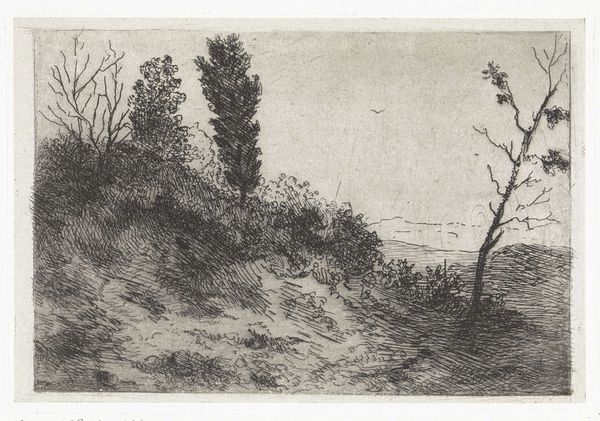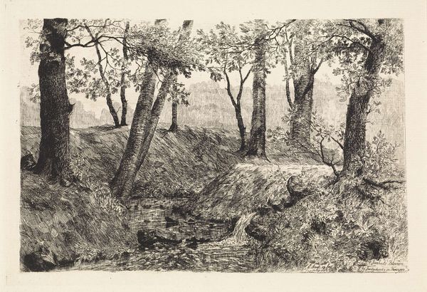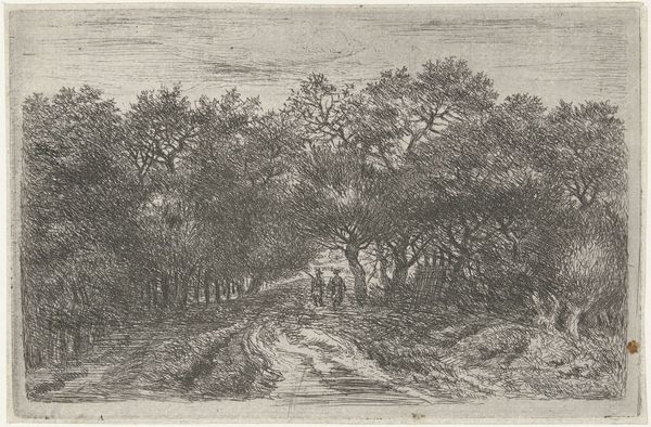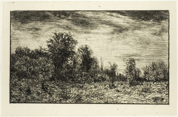 Charles Jacque created this artwork, 'Road at the Edge of a Wood' with etching in 1848, now at the Art Institute of Chicago. The composition is dominated by a dense thicket of trees, their branches interwoven to form a dark, almost impenetrable barrier. A barely visible road cuts through the landscape, its path obscured by shadow and foliage. The overall effect is one of enclosure. Jacque's use of etching lends a textural complexity to the scene. The lines are densely packed in the wooded areas, creating a contrast to the more sparsely rendered sky. This contrast creates depth, drawing the eye into the forest's depths. Here, nature is presented not as an open vista but as an enveloping, almost claustrophobic space. The density of the etched lines suggests a broader commentary on nature's power to overwhelm and obscure. The road, a symbol of human intervention, seems almost swallowed by the natural world, challenging our perception of space and inviting ongoing interpretation.