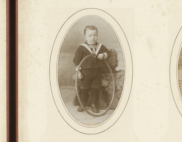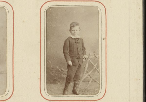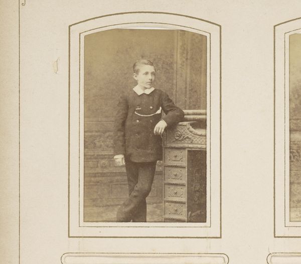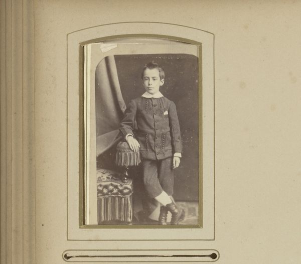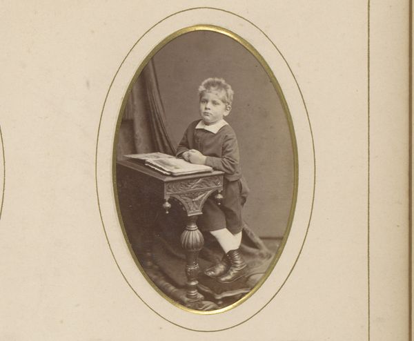 Editor: Here we have "Portret van een jongen met stok in de hand, staand bij een tafel met boek" – or, "Portrait of a Boy with Stick in Hand, Standing by a Table with Book." It’s a gelatin silver print, dating sometime between 1860 and 1900, by Albert Delabarre. It has an undeniable charm to it, but what exactly am I looking at here? Curator: Consider the photographic process itself. A gelatin silver print from this period speaks to industrial advances. Notice how this allows for mass reproduction of images previously available only to the wealthy. Who is commissioning this image? Why? What sort of social currency does this bestow on this particular boy? Editor: It's interesting to think about the mass reproduction element of photography as something that was once a relatively new possibility! The fact that multiple copies of this image could have been produced and distributed really shifts how we think about portraiture, right? How does this impact who could commission art? Curator: Precisely! It democratizes representation but also raises questions about labor and accessibility. Delabarre, like other photographers, was engaging in a commercial enterprise. Who benefitted economically from this technology? Who had access? The finished print hides a whole network of manufacturing and labor. Editor: I hadn't thought about the photographer as also engaging in commerce and contributing to capitalism. So much of the focus tends to be on art as self-expression, it's fascinating to examine it from the perspective of material conditions. It also puts that "genre-painting" tag into a completely new light! Curator: Exactly! Consider the socio-economic background, and suddenly this seemingly innocent image of a boy opens up a much wider view. I always enjoy revealing the hidden sides of things, it certainly makes things more interesting! Editor: This has totally shifted my thinking on not only this image, but others as well! There's always more than meets the eye!