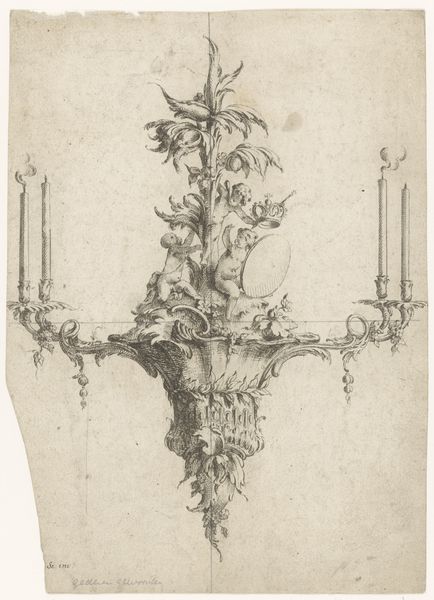 Curator: Here we have Wilhelm Steinhausen's "Final vignette," circa 1884, currently held at the Städel Museum. It's executed in ink and pen as a drawing. What strikes you about it? Editor: Immediately, the sparseness. It feels almost skeletal. The lines are incredibly delicate, suggesting a lightness of touch, but the subject matter seems quite loaded. What was Steinhausen going for? Curator: Symbolically, the piece layers multiple levels of meaning. We have the cross, of course, as a potent religious symbol, interwoven with thorny roses, connoting both beauty and suffering. The dove with the olive branch, usually indicative of peace, complicates this imagery. It suggests a transition, perhaps from strife to resolution, from the earthly to the divine. Editor: Yes, but look at how that cross is rendered: It’s not monumental or imposing; instead, it serves as a central structural support around which Steinhausen assembles the imagery, using the vine's materiality. The thin lines show little regard to the price or quality of materials. What statement was the artist making about art making through this conscious underdevelopment of material? Curator: It emphasizes vulnerability. This vignette speaks to the inherent fragility of life and faith. Notice the stylized sunbursts emerging from the roses—they give an impression of radiating hope despite the thorny setting. The symbolism acts as a commentary on enduring spiritual beliefs tested through personal tribulation. Editor: That's an interesting point; the etching style almost makes it feel like a print being reproduced en masse for general consumption, yet each piece still presents a sense of personalized spirituality based upon materials used. The subtle details reveal that even industrialized artistic creation cannot replace individual experiences in life which allows people agency over personal faith traditions versus following the prescribed ways in religious practices. Curator: It's precisely that tension which draws me in – mass production and a bespoke experience. It allows space for a wide range of people to adopt symbols of cultural faith as well, regardless of how they might perceive those same symbols over time. Editor: Well, after this insightful discussion, I look at Steinhausen's drawing and see a conversation starter: materials can create an entry point that may offer differing interpretations, so long as it challenges accepted historical approaches rooted within art institutions today!