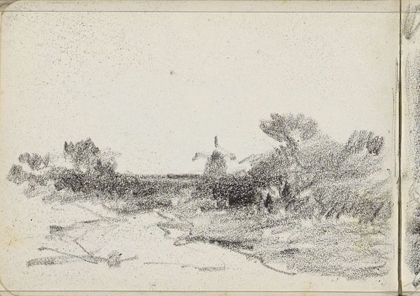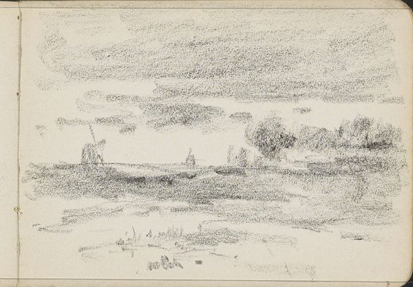 Editor: We're looking at Willem Cornelis Rip's "River Landscape with Mills" from 1905, rendered in pencil. There's a stark simplicity to it; the monochromatic palette and rough lines evoke a sense of quiet industry under a looming sky. What story do you think it’s trying to tell? Curator: It's less about telling a specific story and more about capturing a mood, a specific moment within a larger cultural narrative. Consider the date: 1905. What social and economic changes were happening in the Netherlands at the time? Rip situates the windmill – traditionally a symbol of Dutch prosperity and ingenuity – in this quickly changing world. Does it feel celebratory or cautionary to you? Editor: That’s a good point. The mills almost appear to be fading into the landscape. It definitely carries a sense of anxiety. Almost as if the industrial revolution threatened traditional Dutch identity and economy. Curator: Precisely. The drawing’s rough texture, created with swift, decisive pencil strokes, mirrors this anxiety. Think about the art world as well. Impressionism, with its emphasis on fleeting moments and personal expression, challenged the academic painting traditions of the 19th century, disrupting established institutions of taste. So, the work becomes, in some ways, a statement on a shifting art world and society in general. Does knowing that shift your interpretation? Editor: Absolutely, it gives the drawing a new depth. I thought it was just a simple landscape sketch, but it represents cultural anxieties. Thanks! Curator: My pleasure. Every artwork participates in multiple narratives.