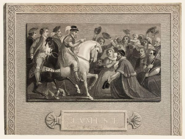 Editor: This is "Return from Hawking" by Samuel Cousins, from the 19th century. It's very detailed, and I find the composition quite striking with the figures arranged around the horses. What visual elements stand out to you? Curator: The engraving technique itself commands attention. Observe how Cousins uses fine lines and tonal gradations to create texture and depth. Note the interplay of light and shadow; how the light catches the figures, drawing the eye towards the center, while the surrounding architecture recedes into subtle darkness. What does that structure suggest to you? Editor: I guess it adds a sense of grandeur and frames the scene, doesn't it? It gives a theatrical quality to the whole event. Curator: Precisely. The composition, with its balanced asymmetry, directs the viewer's gaze, creating a dynamic yet harmonious whole. A masterclass in visual storytelling through formal means. Editor: I never thought about the technique as part of the storytelling itself. Thanks! Curator: My pleasure. It’s crucial to remember that form is not merely decorative; it’s integral to the work’s meaning.