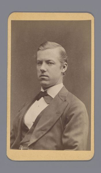 Curator: Henri Ostis created this photographic portrait, dating from around 1870 to 1880. It's a gelatin silver print, capturing an unknown man. My initial impression is of understated elegance. The sepia tones and classical composition give it a timeless feel. Editor: Timeless, perhaps, but I also see a potent commentary on societal roles. Looking at this portrait, I see a representation of masculine identity within a strict, bourgeois framework. His neatly groomed hair and meticulously tied bow convey respectability. Curator: You make an interesting point. But let's consider the formal elements for a moment. The careful use of light creates depth and dimension. It emphasizes the subject's features, inviting the viewer to contemplate his character. His piercing gaze makes for a solid focal point, and the texture in his coat draws the eye across the image. Editor: And that very gaze, sharp and self-assured, speaks volumes about the subject’s social standing and the expectations placed upon him. This man, although nameless to us, embodies the ideals of his time: authority, restraint, and social decorum. This image serves not only as a recording of a particular man but as evidence of prevailing values in 19th century society. Curator: Yes, there is that context for us to consider too, yet still, I would invite one to see also how Ostis utilized a muted tonal range; how the subtlety is striking. How does this build a particular mood or effect through contrasts, while allowing the texture to create greater richness in such an unassuming image? Editor: And that rich materiality serves as a vehicle for understanding the rigid power dynamics at play, the performance of class and the pressure to uphold standards. Photography during this era reinforced class distinctions, didn’t it? Curator: Indeed, which underscores why approaching Ostis’ portrait demands attention to social constructs—to what's depicted, how, and, of course, the inescapable implications. Editor: Precisely. Examining it formally allows us to further unpack social realities and inequalities—it provides unique insights that mere historical accounts often fail to capture. Curator: It’s always revealing to reflect upon those broader concepts that photography serves to frame, while admiring the image in itself. Editor: A dialogue where technique illuminates history—perfect!