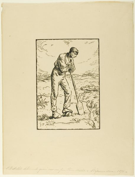 Editor: This etching, “Boer maait het land,” from 1879 by Frans Van Kuyck, depicts a farmer scything a field. I find the scene incredibly peaceful, despite the hard labor it represents. What draws your eye when you look at it? Curator: It evokes a deep sense of cultural memory. The lone figure, dwarfed by the landscape, speaks to humanity's enduring relationship with the land. Note how Van Kuyck positions him not just in space, but almost *of* the land; his hunched posture and simple garments rendering him nearly indistinguishable from the field he toils. Do you see that continuity in other landscapes? Editor: I hadn't thought about that blending before. Most landscapes I know set people *in* the scene but separate, almost posed. Here, he feels integral. But how does this connect with that cultural memory you mentioned? Curator: Precisely. Think of how images of agricultural labor are interwoven with notions of national identity and perseverance. Consider classical paintings—how do they represent farmers compared to this etching? This humble scene, absent of idealization, feels more genuine. It mirrors a respect for everyday life, resonating even today. What feelings does that generate in you? Editor: It makes me think about where my food comes from and the effort it takes. It definitely challenges the romanticized version of farm life we often see. Curator: Exactly! This artwork doesn't offer an escape; it presents a reality, a cyclical process tied to both individual effort and shared cultural experience. The symbols of hard labor, and connecting to landscape paintings, tell stories that shift across time and are reshaped by history and by culture. Editor: It’s amazing how much meaning is packed into such a seemingly simple image. It’s really made me reconsider how I see landscapes in general. Curator: Indeed. The true power of images lies in their capacity to hold these multiple layers, sparking continuous dialogue across generations.