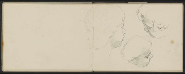 Curator: Let’s turn our attention now to this intriguing page, "Zwei begonnene Studien von Gesichtern (Sketches of Faces) [p. 50]" by Max Beckmann. It's a humble pencil sketch. What are your immediate thoughts? Editor: Chaotic. My eye darts all over. There's a scattering of fragmented forms, as if multiple perspectives are battling for dominance on a single plane. The pencil line itself is agitated, nervous almost. Curator: Beckmann often explored themes of psychological tension and the fractured self in his work, aligning with the broader scope of German Expressionism. Here, in what appears to be studies of faces, we can see the human form deconstructed and reassembled. Editor: Indeed. The hatching and scumbling certainly create a sense of unease. Look at how the marks become almost violent around the jawline of the lower face. The fragmented nature disrupts any clear reading, pushing towards something unsettling. Is that intended or a consequence of the rapid style? Curator: The rapidity speaks volumes. Think about the historical context, too. These studies might have been preparatory sketches for a more fully realized artwork or rapid expressions from his psyche, a raw documentation of interior life shaped by wartime experiences and existential angst. The fragmented faces might mirror his feelings towards himself. Editor: You’re drawing on the powerful autobiographical readings in Beckmann’s output. Semiotically, that makes sense. We instinctively try to create unified images from these disparate marks and shapes, mirroring the impulse towards wholeness and healing within trauma. Curator: I think you’ve touched on something essential about its appeal and enduring power. Editor: Agreed. On reflection, the incomplete nature invites participation. We’re asked to fill the gaps, to reconstruct not just the faces, but also a sense of internal coherence in the face of disruption and displacement. Curator: A poignant note to end on. Thank you. Editor: Thank you.
