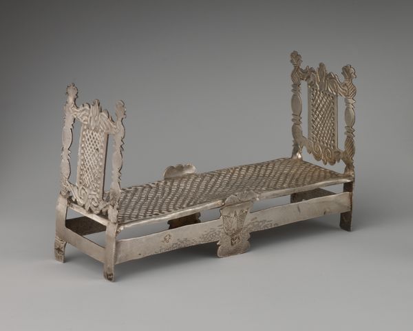 This miniature chair was created by George Manjoy, probably in the late 17th or early 18th century. One of a set of four, it's made of silver – not a typical material for furniture, even at this small scale. The chair's form and decoration look back to the Renaissance, a style that was already old-fashioned when it was made. We can imagine the maker carefully cutting, filing, soldering and engraving the precious metal. This would have been painstaking work, demanding great skill and time. The chair's small size and the preciousness of the material speak to a culture of collecting, and the desire to possess miniature versions of grand objects. The chair’s original context would have likely been a ‘cabinet of curiosities’, a collection that included both natural specimens and human-made objects. Though small, the chair is full of details, like the woven seat and ornate carving. It is a virtuoso display of craftsmanship and a potent emblem of wealth and status.