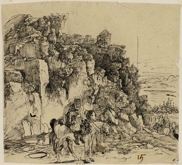 Curator: Rodolphe Bresdin's "Caucasian Landscape," likely created between 1822 and 1885, presents a beguiling scene rendered in pen, ink, and print. What strikes you about it initially? Editor: Chaos. Beautiful, controlled chaos. A whirlwind of lines. It feels almost… anxious. The composition seems to be bursting with energy. Like nature is trying to break free. Curator: An apt description, really. Bresdin's technique involves a dense network of meticulously rendered lines. Considering his historical context, it feels like the natural world is literally fighting against being captured, labeled, controlled. What appears beautiful also hints at deep discordance. Editor: Absolutely. This piece resonates with the complexities of landscape art within colonial discourse. These "untamed" spaces that were simultaneously romanticized and exploited... look at how even the plants are drawn almost defensively! Are those people riding on horseback towards the cityscape? Curator: Indeed. The meticulous detail he gives to the landscape contrasts so sharply with the more loosely sketched figures riding toward what looks to me like an Ottoman city in the distance, and it makes me think of movement, travel. This artwork itself seems to document or perhaps imagine, an expedition into new lands. The journey might appear one way at the beginning, but shifts once encountered in person. Editor: This idea of encountering something new… that's potent. Because when you see the people going to the town in the distance, it also feels a little like conquest. Bresdin lived through times of intense colonization. How can we look at this idyllic, hyper-detailed landscape without thinking of the land as something already inhabited, claimed? Whose gaze are we adopting? Curator: A potent question, certainly. I'd say the drawing demands such self-awareness. Bresdin doesn't allow us to passively observe. The work confronts us, forcing us to actively question how we understand "landscape" itself. And honestly, given his life of poverty and constant movement, I almost feel a sense of restless wandering baked into this particular image. Editor: Perhaps the beauty lies in the tension, in the acknowledgement of that restlessness. Thank you. This has opened up so many new perspectives for me. Curator: It’s been my pleasure. Hopefully, our discussion has opened a few new paths of inquiry for our listeners as well.