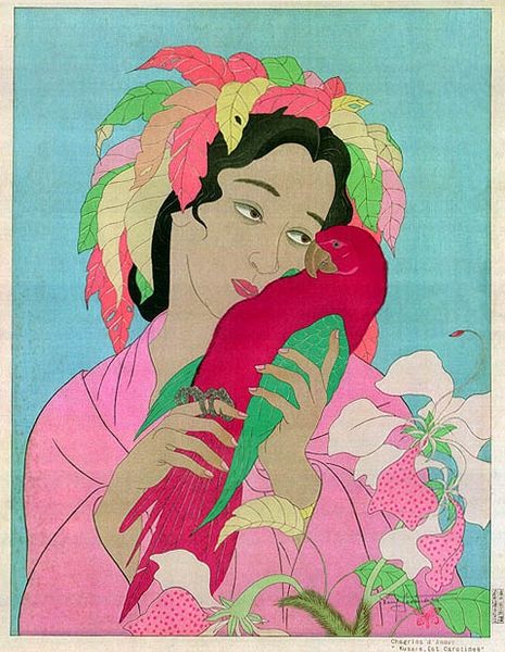 Paul Jacoulet made "Les Paradisiers. Menado, Celebes" using woodblock printing, a technique rooted in both art and craft traditions. Woodblock printing requires a collaboration of skilled artisans, from the artist who creates the initial design, to the block carver who painstakingly translates the image into a series of wooden blocks, and the printer who applies ink and presses the paper to create the final print. Each color in the print requires a separate block, demanding precision. Jacoulet was fascinated by the ethnic diversity of the Pacific islands. This image, though aestheticized, is full of observations of cultural practices and dress. Jacoulet's art reflects the labor-intensive processes that are often overlooked in traditional art history. By emphasizing the value of materials, making, and context, we challenge the distinction between fine art and craft.