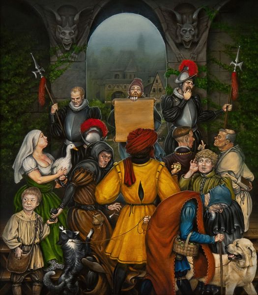 Editor: So, here we have Kent Monkman’s “Wedding at Sodom,” painted in 2017 using, it seems, mixed media on canvas. The piece has so many figures in it, and there's a clash of styles; it's vibrant but unsettling. What can you tell me about this provocative painting? Curator: What's fascinating to me is how Monkman uses oil paint, a medium historically associated with the documentation and glorification of colonial power, to disrupt and subvert those very narratives. How do you interpret his appropriation of landscape and history painting conventions? Editor: I see how he’s reusing the techniques and materials of the colonizers to tell a different story, a story of Indigenous experiences, desires, and resistance. It feels like he’s trying to reclaim agency in the representation of his own community, almost a form of artistic activism? Curator: Precisely. Consider also the labor involved in creating such a large-scale work. The sheer time and skill required underscores the dedication to his message, which is to critique the history painting genre. Who, in the painting, seems to you to bear the weight of history? Editor: I'm drawn to the figures on the edges. The piece asks you to reflect on their stories, to challenge accepted narratives, and understand the complex interplay of materials, labor, and cultural representation in the making of art, and history. Thank you. Curator: Indeed. Examining the materiality and production process sheds light on the power dynamics at play and helps to re-evaluate whose stories are told and how they are remembered through art. It makes you reconsider painting's cultural relevance, doesn’t it?