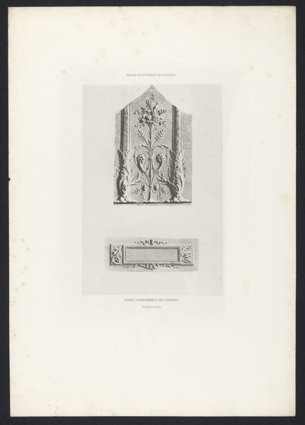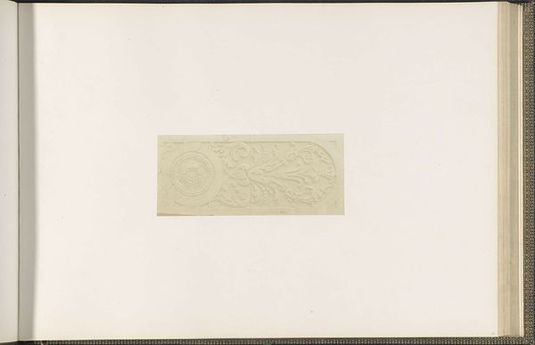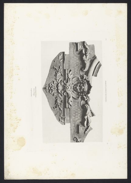 Edouard Baldus created this print of an arabesque ornament, possibly from the Palais des Tuileries in Paris. The work presents a monochromatic study of architectural detail, focusing on texture and form. The elaborate design, rendered with meticulous precision, invites us to consider the interplay between light and shadow across its surface. The composition is structured around a vertical panel filled with swirling foliage, floral motifs, and classical figures. Baldus masterfully uses light to accentuate the depth and relief of the carving, creating a play of textures. The photograph serves as a document, but also an aesthetic exploration, where the ornament's intrinsic beauty takes precedence. The Palais des Tuileries, as a structure, was meant to project power and taste. Baldus' print captures this ambition, freezing in time the artistic intentions of the palace's design. This work, while seemingly representational, transcends mere documentation to become an exploration of how architectural elements communicate cultural values through their very form.