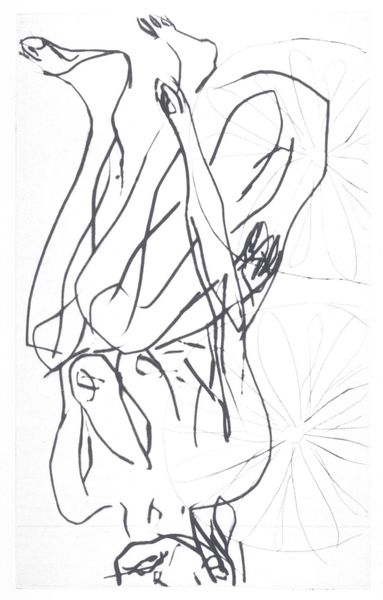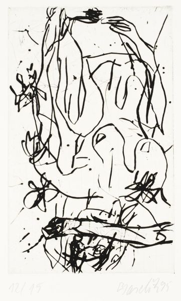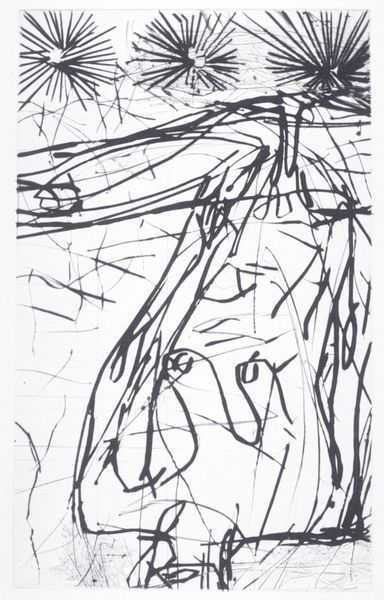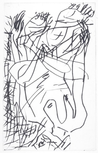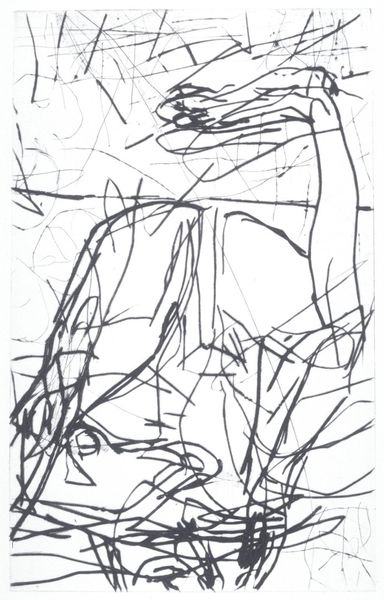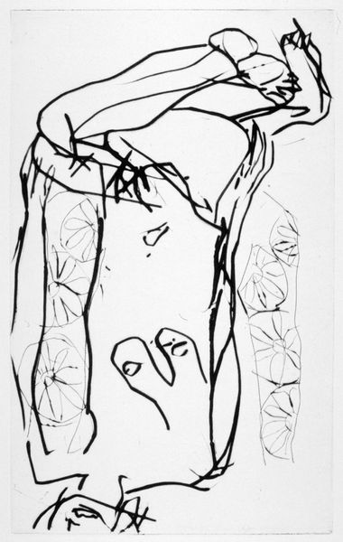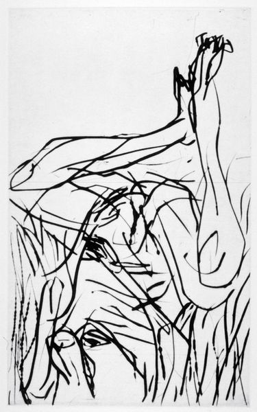 Curator: This etching by Georg Baselitz presents an inverted figure rendered with stark, wiry lines against a sparsely etched background. The work is currently held in the Tate Collections. Editor: It strikes me as a raw expression, almost frantic. The figure's disorientation is mirrored in the chaotic, tangled lines, giving it an immediate visceral impact. Curator: Baselitz often inverts his figures, a motif he began exploring in the late 1960s. Some see this inversion as a disruption of convention, forcing us to reconsider our perceptions of reality and the human form. Editor: I see the inversion as a disruption of perspective, like a mirror image fractured across a plane—the figure's anatomy is presented like a puzzle, forcing one to analyze its lines and negative space, the tension between form and absence. Curator: Precisely. Baselitz's images invite us to question what we consider normal, what is right-side-up, and how that influences our understanding. The scrambling of the figure perhaps speaks to a similar scrambling of cultural memory and certainty in post-war Germany. Editor: It’s a composition that dares you to confront its angularity and find meaning within what feels like deliberate discord. It's a powerful piece, charged with emotional complexity. Curator: Indeed, its starkness makes it unforgettable. Editor: A truly impactful piece!