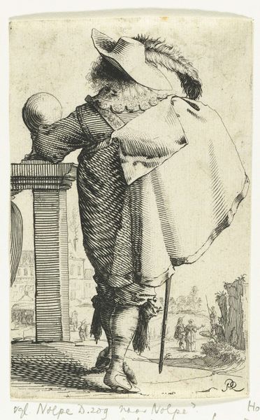 Editor: Here we have "Men and women at a counter," possibly from 1860, created by A. Dickhof. It's an engraving, and it’s teeming with people! What strikes me is how theatrical the central figure is; he almost seems to be performing. What do you make of this bustling scene? Curator: Ah, a performance indeed! Or perhaps an illusion. This engraving, with its Baroque flourishes, invites us into a world not quite our own, yet oddly familiar. The crisp lines of the engraving style heighten the almost satirical observation of human interaction, no? The gentleman centre-stage, displaying wares of… something, captures your gaze. Look closer. Notice the somewhat cartoonish rendering, the sharp lines used to highlight expressive features and intricate clothing. Editor: You're right, there's almost a caricature quality to the figures, especially their hats and expressions. It makes me wonder, is it celebrating or poking fun at commerce and social gatherings? Curator: I see it as a mirror to the societal vanities and commercial fervour of the time, albeit with a knowing wink. Note the contrast between the sharply-etched clothing and the blurry facial renderings; are they as important as the status they show to the world? Do the products being traded here hold real value, or just illusory promises? It all feels very self-aware, don’t you think? What message do you read at the bottom of the piece? Editor: Oh, it looks like the old dutch states "Better a swollen body, than a burnt mouth." Perhaps alluding to the fact that even though there may be excesses, it’s better to have it than not. This almost changes the whole perspective on the performance! Curator: Indeed. It all makes it resonate more, doesn't it? Art that not only presents a visual story, but a witty proverb about enjoying earthly treasures. It really stays with you, once the underlying meaning unfolds. Editor: I agree. I hadn't noticed all that hidden beneath the surface, it makes you want to decode what treasures *you* covet versus require. I have a feeling this little engraving could provoke thought for days.