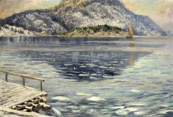 John Collier painted *Spring at Cadenabbia*, using oil on canvas, and presents a vista dominated by cool blues and greens offset by the brown trunk of a prominent tree. Its branches reach across the canvas, partially obscuring the distant landscape. Collier’s composition divides the canvas into distinct horizontal zones. The foreground is dominated by the vertical tree trunk, creating a screen through which the viewer observes the scene. The middle ground features the tranquil lake, dotted with small sailboats that suggest movement and activity. In the distance, the blurred, muted mountains provide a backdrop, their peaks softly meeting the sky. The structure directs our gaze, inviting us to consider how constructed viewpoints shape our understanding and appreciation of nature. It reminds us that what we see is always mediated, challenging the idea of a purely objective landscape.
