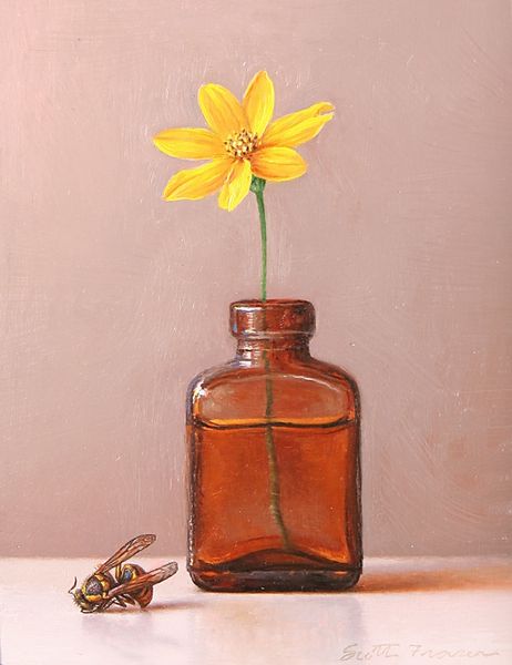 Scott Fraser made this still life of snowdrop anemones at an unknown date using paint. It’s interesting to note the smooth, almost blended brushstrokes; they create a soft, realistic feel that’s quite calming. You can see a real emphasis on the process of refining and smoothing the paint. The way Fraser captures the light reflecting on the glass bottle and petals is really great. The light isn't just painted on; it feels like he's coaxing it out of the surface. Look at how he's handled the petals, building up thin layers of white to capture the subtle gradations of light and shadow. There’s this one petal, on the left, that curls back—it’s like a tiny gesture, almost a whisper of movement, that brings the whole thing to life. I’m thinking of someone like Giorgio Morandi, who also had this knack for turning simple objects into something meditative and profound. Ultimately, this piece reminds me that art isn't about answers, but about opening up spaces for quiet contemplation.