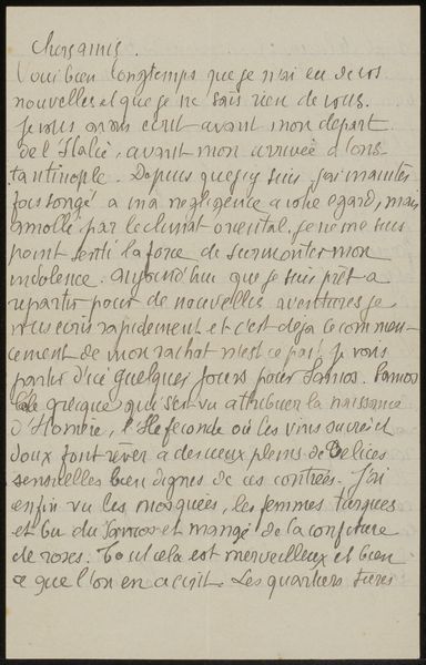 This is "Brief aan Andries Bonger," a letter written by Emile Bernard. Though undated, it gives us insight into the artistic dialogues of the late 19th century. Bernard, writing to his friend Andries Bonger, shares his thoughts on art and travel. Bernard reflects on the potential of Constantinople as an artistic hub, drawn to its Byzantine heritage. His references to "l'art moresque, arabe" and "oeuvres étrusques" point to the era’s fascination with non-Western and ancient artistic traditions, reflecting a desire to break from academic conventions. The letter reveals a tension between tradition and innovation. Bernard critiques the Crusaders and artists who "ne se montrerent pas méprisants," suggesting a rejection of closed-mindedness in favor of exploring new harmonies. The personal nature of this letter underscores the emotional and intellectual exchanges that fueled the artistic ferment of the time. It invites us to consider how personal experiences and beliefs shape our understanding and appreciation of art.