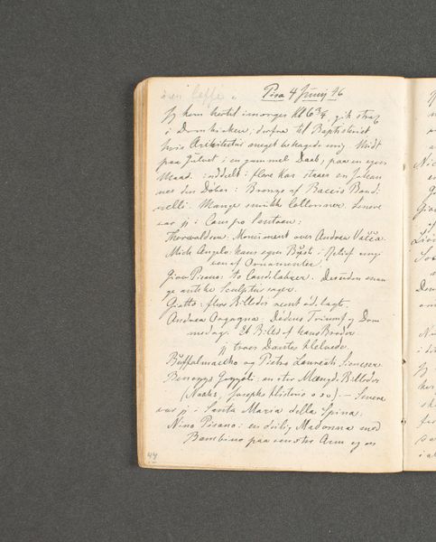 Johan Thomas Lundbye created this page from his travel journal in Novi Ligure. It's inscribed with text; even in writing, we find echoes of artistic tradition. Consider the recurring motif of the 'gaze' subtly embedded in the script through mentions of portraits. The gaze, historically, is a potent symbol of power, knowledge, and interaction, deeply explored across art history. Think of the Mona Lisa's enigmatic look, which draws viewers into a silent dialogue across centuries. This motif isn't just visual; here, Lundbye captures it through textual references, suggesting a deeper psychological engagement with observation and memory. I am reminded of how the 'gaze' resurfaces, constantly evolving. In ancient Egyptian art, the unblinking eyes on sarcophagi were meant to ensure the deceased could still see and be seen in the afterlife. This connection to mortality and visibility links back to our own modern obsession with representation and being seen, be it through social media or other means. The primal need to be recognized remains, echoing through time.