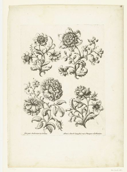 Curator: This drawing, entitled "Sheet with Flowers from an Album," was created anonymously sometime between 1630 and 1718, using ink and pen. It is currently held in the collection of the Rijksmuseum. Editor: What strikes me immediately is the almost scientific approach—these aren't just beautiful blooms, they’re specimens, rendered with a dedication to detail and an interesting sense of decomposition or transition, especially the flower in the middle. Curator: Absolutely, the anonymous artist utilizes the inherent qualities of ink to generate contrasting tonalities and distinct outlines. Consider how the intricate line work and varying densities create depth. The forms of these botanical elements carry their own structure. Editor: It's intriguing to consider how these images would have been interpreted in the 17th century. Flowers carried strong symbolic weight - symbols of love, life and beauty of course, but their decay often represented vanity and the fleeting nature of existence. Did they signal vanitas? Curator: That's a fascinating interpretation. The interplay of light and shadow certainly brings to mind Dutch Golden Age still life, however it seems too soon to assume such symbolism. We cannot ignore how well organized and meticulously represented each flower form appears here. This suggests more an interest in typology. Editor: Perhaps it is about both. Even today, the way the artist renders light on wilting petals has an almost melancholic impact. One cannot separate the emotions generated in tandem with those flowers and plants rendered. Curator: Undoubtedly the artist plays with visual tension. These pen drawings show botanical elements at differing stages—some in fullness, some decaying. Notice also the artist’s delicate penmanship which contrasts well with decay shown at middle-top. Editor: Well, seeing those symbolic layers while analyzing the formal elements allows me to feel even more strongly that while the botanical accuracy is key here, it may reflect also an element of our mortality. Curator: Indeed, and studying how ink and form come together, with such detailed application across varied texture, does seem to hold additional implications. A beautiful piece from the Rijksmuseum!