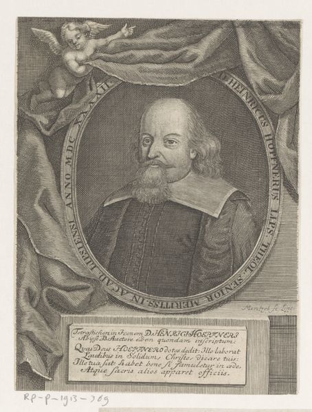 Editor: So, this is "Portret van Ludwig Friedrich von Württemberg-Mömpelgard," an engraving by Jacob van der Heyden. It was created sometime between 1596 and 1645. There's something rather formal about it, but those intricate details in the oval frame…almost soften it somehow? What do you see when you look at it? Curator: It whispers tales, doesn’t it? Baroque flourished in the 17th Century in reaction to the sobriety of mannerism. This engraving reflects an almost restless era: a society of elaborate court dress, royal authority and colonial expansion. It feels almost contradictory; like he's looking to the future while rooted firmly in tradition. Do you feel the weight of those words surrounding the portrait? Editor: Absolutely, they are all quite grand and serious. What was the role of printmaking at this time? Curator: Printing, particularly engraving, was like the social media of the time. It was used to disseminate imagery. In the Baroque era the printing techniques mirrored the drama of painting through striking and visually exciting imagery. This artwork exemplifies how engravers use dramatic ornamentation to convey powerful meaning to their audiences. And this, as an aside, is why historical analysis is a constant exploration - how do we ‘read’ that historical social media now? Editor: That's a fantastic way to look at it. It’s like each tiny line has a purpose in spreading that message! I definitely see it differently now. Curator: Exactly. It encourages us to imagine what Ludwig Friedrich would be hoping to tell us! What story does the image try to make?