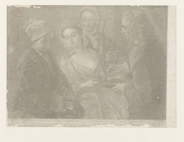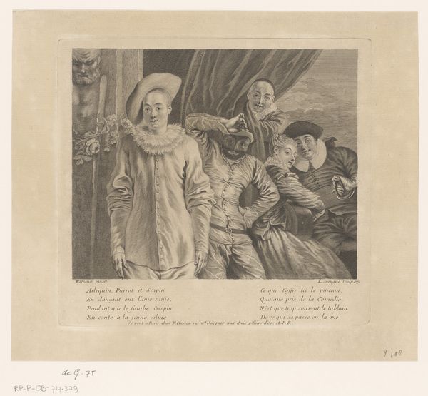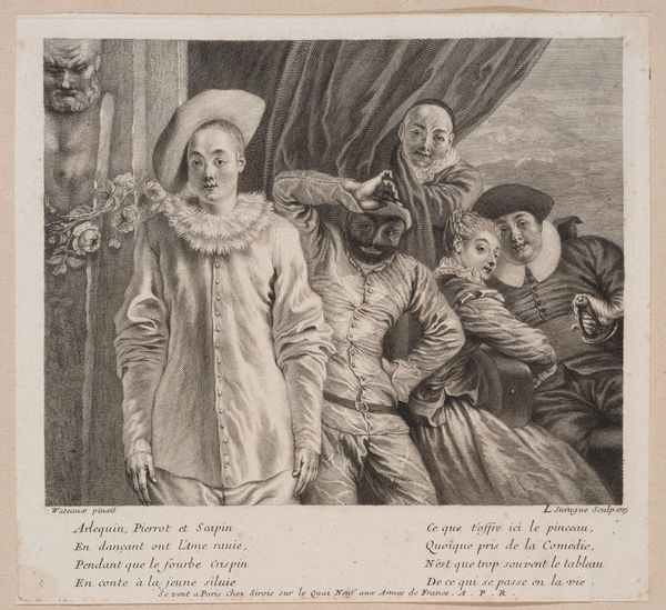 Curator: Louis Surugue's engraving, "Harlequin, Pierrot, and Scapin", presents a scene of theatrical characters frozen in an ambiguous narrative. It makes me think about power dynamics within performance. Editor: The first thing that strikes me is how the etching process renders the costumes with such tactile detail. You can almost feel the weight of the fabrics, the rough texture of the masks. Curator: Indeed, this tactile rendering, almost a sensuality, seems at odds with the rigid social structures of the Commedia dell'Arte, reflecting perhaps the controlled subversion they represented in their time. Editor: Absolutely. The craft of capturing this supposed high art is fascinating. What workshops and labor went into creating this single plate? Curator: Thinking about the context of the piece, these Commedia dell'Arte characters functioned as social commentators, mocking aristocracy and pushing boundaries through satire. Surugue immortalizes this critical role. Editor: Precisely. Considering the material constraints of 18th-century printmaking provides an interesting lens through which we can examine the subject of theatrical performance. Curator: Thinking of the characters like this, it shifts my perspective on the narrative, it feels more layered now. Editor: Agreed. The process really underscores the social impact of these visual artifacts.
