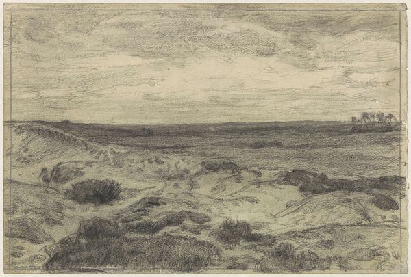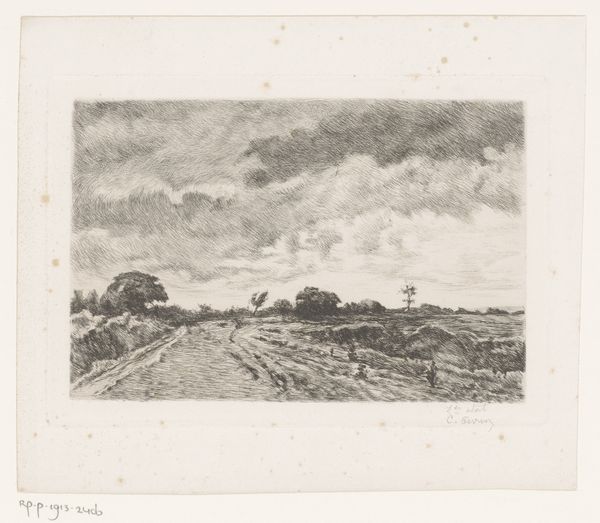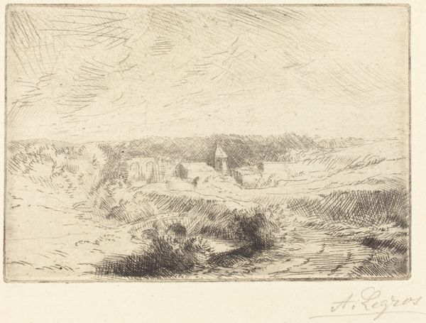 Editor: This etching, called "Prospect (Le point de vue)" by Alphonse Legros, is so delicate. I am drawn to the landscape and the contrast between the sky and the land. How do you interpret this work? Curator: For me, the beauty lies within the process itself. Etching is about labor, isn’t it? Consider the physical act of incising the plate. The time spent, the tools used...each line a conscious mark. It's a testament to Legros's command of the craft, a craft born from the practical necessity of reproducing images. The material choices -- the copper plate, the acid, the paper – are essential. Editor: So, you're thinking about the labor that went into producing the etching? Does that change how you view the final artwork? Curator: Absolutely. The social context is crucial here, too. In a time when painting was deemed ‘high art,’ printmaking provided broader accessibility, a means for wider distribution. Legros, with his precise lines, bridges a gap between high art and the more accessible world of printmaking, questioning the artificial divide between the unique art object and mass-produced imagery. Where does this leave the individual and their access to beauty? Editor: That’s a good point about accessibility; printmaking does have that democratizing effect. The skill of making a detailed landscape with a specific intent opens more to unpack than I originally thought. Curator: Exactly. Considering art from this materialist perspective can really deepen one's understanding, couldn't it? The final artwork is just a stop on a path. Editor: It has. I’ll definitely think more about materials and how art is produced.