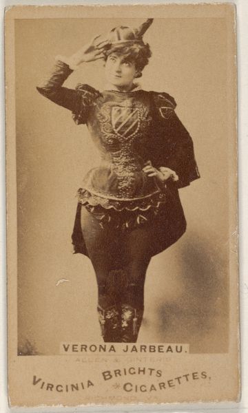 Curator: This is an 1889 print called "Miss Jarbeau, from the Actresses series," published by William S. Kimball & Company. Editor: There's a wistful quality to her pose, that salute almost seems a farewell. And those theatrical costumes! It really emphasizes her legs and midriff while covering everything above the clavicle. Curator: The "Actresses series" was a set of trade cards distributed with Kimball cigarettes. These cards, very popular in the late 19th century, often depicted actresses, athletes, or other public figures. Kimball sought to capitalize on the emerging cult of celebrity and create collectables to boost sales. Editor: It’s amazing to think about how this tiny portrait worked to project ideas of beauty and success. Even her costume, with that symbolic crest on the breastplate – it all feels so loaded with unspoken messages. Curator: Absolutely. It's carefully constructed image. The outfit looks loosely derived from traditional performance clothing of commedia dell'arte. Yet, it’s altered. Made a little bit cheeky. That costume certainly played a role in constructing a desirable image, furthering her fame while driving consumer desires. Editor: Exactly! The costume reads like an archetypal Amazon—an armored woman on the frontlines of entertainment! The gesture is powerful as well, echoing a common heroic position across millennia, linking this “modern woman” to mythic feminine forms! It speaks to something deep and enduring about her impact, and celebrity more generally. Curator: What’s so interesting is considering how these relatively inexpensive cards participated in establishing, and normalizing particular beauty ideals at that time. The series helped reinforce certain socio-cultural values. These images not only sold cigarettes, but sold a vision of the modern woman in public life. Editor: A modern Amazon, indeed! I wonder what Miss Jarbeau would have made of her immortality via the wrapper of a cigarette packet. An fascinating encapsulation of fame, commerce, and identity. Curator: Precisely. And that makes looking at an item such as this far more interesting, perhaps, than the initial glance might indicate.