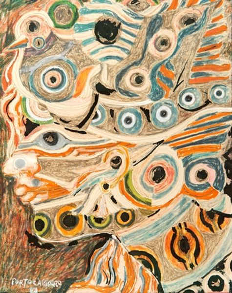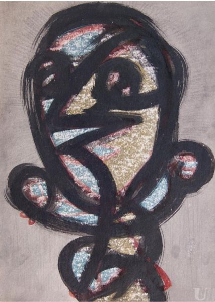 Vajda Lajos’s "Silver Gnome" is made with what looks like ink and paint. I love the scumbled ground of silvers and grays, almost like the stuff of clouds, the support peeking through, and how this is contrasted with the marks making up the gnome. A tightly clustered mass of browns and tans, built up of many tiny marks that remind me of hair, it has so much concentrated energy. The gnome is a strange but lovable character. The pale blue triangle sitting above the hands is a very nice touch, it’s like a portal to a different kind of space, maybe the space of the imagination, and it’s echoed by the two almond-shaped eyes looking out at us. The surface is ambiguous, full of these kinds of plays between foreground and background, flatness and depth. It makes me think of Paul Klee’s childlike figures and playful approach to abstraction. It’s a nice reminder that art can be both serious and totally weird.