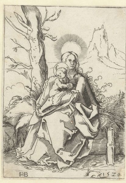 Curator: Let's examine "Virgin and Child in the Clouds," an engraving completed in 1641 by Rembrandt van Rijn. What strikes you upon seeing this piece? Editor: The starkness. There's a vulnerability to it. It isn't idealized. There's a real sense of the maternal here, but one burdened by worldly cares, by a distinct lack of divine support, almost like a Madonna of the everyday. Curator: I appreciate how you immediately draw attention to the figures' relationship, but also how you perceive that through their formal construction: notice the linear network; a very carefully structured arrangement where the composition’s tonal unity brings our eye to the figures, and allows us to interpret the mood as one of earthly realism instead of heavenly opulence. Editor: And I can't help but wonder if that was intentional given the political and religious tensions in the Dutch Golden Age. Is Rembrandt perhaps commenting on the Catholic view of the Holy Mother, humanizing it for a Protestant audience? What do you make of the radical departure from typical depictions of the Madonna at that time? Curator: I don't find any real "radical departure." Instead, it reads as the work of a master engraver concerned, like many others, with mastering perspective, line and form. While context matters, reducing it to a mere religious statement overlooks his meticulous engraving technique, the texture he creates. His command of the medium itself conveys so much of its meaning. The composition of chiaroscuro is perfectly executed, look how strategically Rembrandt manipulated shadows to imbue the image with depth, further highlighting the formal relationship. Editor: But what if that use of light and shadow is purposeful for social critique, showing a contrast between ethereal belief and lived experience? Can we ignore that the Protestant Reformation challenged elaborate Catholic iconography and created space to showcase the human aspect? Curator: We seem to perceive distinctly disparate aspects of the work. Yet I find in the visual structures themselves a powerful evocation of harmony through the perfect use of graphic articulation. I find a testament to Rembrandt's craft. Editor: And I find that those articulations provide insights into 17th century perspectives of gender, religion, and daily life. Art isn't just an image, but an invitation into nuanced discussions of what matters.
