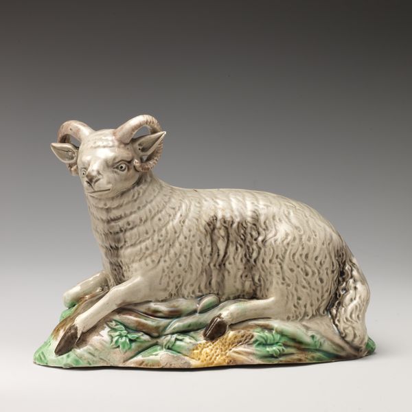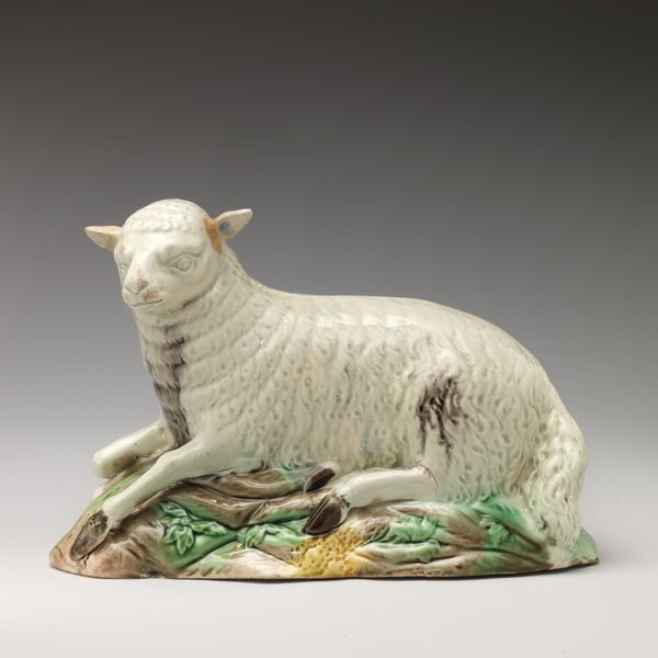 Editor: Here we have a ceramic sculpture, "Doe (one of a pair)" crafted sometime between 1775 and 1785 by Ralph Wood the Younger. I'm immediately struck by its serene posture, it seems very delicate. What layers of interpretation does this piece unlock for you? Curator: This sculpture, part of a pair, speaks volumes about 18th-century sensibilities and their connection to the natural world. But, let's look at it through a lens of class and privilege. Do you consider where decorative objects like this would have been displayed and by whom? Editor: Probably in a wealthy home, adding to the ambience. But what’s particularly telling about that? Curator: Precisely. These were status symbols, reflecting the owner's refined taste and access to luxury goods. While seemingly innocuous, such portrayals of nature conveniently elided the realities of a rapidly industrializing England – land enclosure, the exploitation of natural resources, and the disruption of rural communities. It presents a highly sanitized and aestheticized vision of nature, available only to the elite. How does the ceramic medium itself factor into this reading for you? Editor: I suppose the fragility underscores the protected, almost idealized status of the animal and the environment it represents, completely detached from any notion of wilderness or ecological struggle. Curator: Exactly! This idealized representation obscures more complex relationships between humans and the natural world. Think, too, about the cultural meanings associated with deer, often symbols of feminine virtue or pastoral leisure, further distancing them from the lived experiences of most people. Editor: I never considered the object's cultural and socio-economic context so thoroughly before. Curator: It reveals how even seemingly harmless art can be deeply embedded in social power dynamics and ideological projects. Editor: Thank you. I now have a richer perspective on art's complex relationship to history and social class.