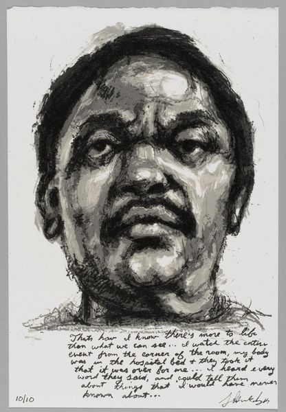 Curator: Sedrick Huckaby's work, 99% NO.78, is a striking portrait rendered with such visible energy in what seems to be charcoal or graphite. The texture feels almost rough to the touch. Editor: The rawness certainly conveys a mood—a vulnerability, amplified by the handwritten text surrounding the figure; the words seem to express an internal struggle. The materials emphasize this honesty. Curator: Absolutely. It's a small work, but the density of the marks speaks volumes about the artist’s process. Huckaby uses the immediacy of drawing to get at something very human, very tangible. Editor: And in that way, the piece pushes beyond representation. The subject is clearly dealing with identity, faith, and perhaps even societal pressures. This interplay between text and portrait is what makes this piece feel so incredibly relevant today. Curator: I agree. Seeing the labor involved brings new meaning to the artist's ideas. Editor: Indeed.