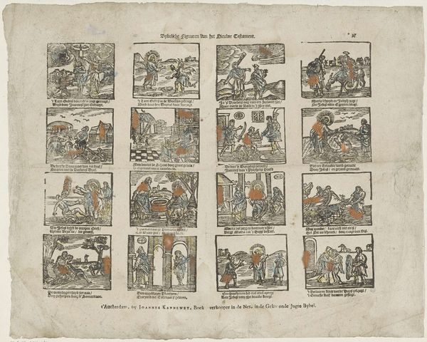 Curator: We have here an engraving, dating from 1723 to 1748, entitled ''t Nieuwe Testament verbeelt zig hier figuriglijk, / Voor u niewgier'ge jeugd, wel leeft het dan geduriglijk,' created by Isaak van der Putte. It's a mixed-media piece. Editor: That's quite a title! It's at the Rijksmuseum, right? What I immediately notice is the compartmentalization; each biblical scene is set within its own framed panel, like a comic strip. How do you read the overall composition? Curator: Precisely. Note how each framed scene functions as an individual unit, yet all are connected formally through the grid structure. Consider the effect of this regular repetition. What principles of organization might be at play? Is it simply seriality, or is something more complex happening between the scenes formally? Editor: I see what you mean. The slight variations in the borders of each frame draw attention to the individual scenes, but the repetitive format also creates a visual rhythm across the entire work. And there’s the addition of colour in sections, almost like someone hand-painted selected elements after printing. Was that common? Curator: The selective colouring underscores certain key motifs, wouldn't you agree? The artist deliberately accentuates portions within specific scenes to establish visual linkages. Reflect upon how these choices manipulate the viewer’s gaze across the expanse of the entire print. This approach contributes to both the unity and diversity of the composition. How does this impact our reading? Editor: So, by highlighting particular elements, the artist guides us to connect scenes thematically despite their individual frames, playing with both structure and symbolism. Thanks, I'll definitely be looking at other baroque narrative art through a new lens now! Curator: Indeed, and understanding the formal elements allows us to see past the subject and engage with the construction of meaning itself. A fruitful approach.